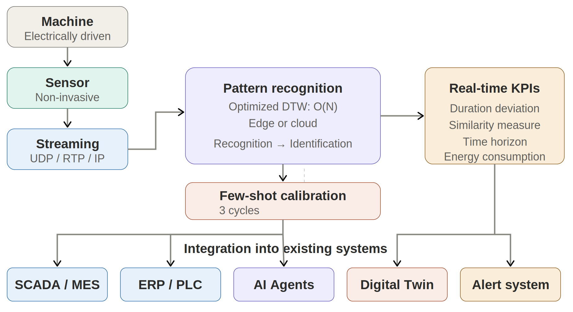 The present invention describes a computer-implemented method for the scalable real-time status detection of processes and/or sub-processes in electrically driven production plants.